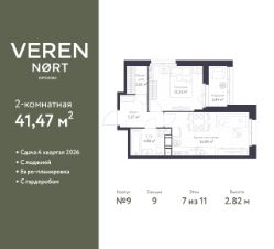 1-комн. квартира от застройщика в Veren Nort Сертолово на 7 этаже. Квартира без отделки, новый собственник может сделать ремонт по индивидуальному проекту. Общая площадь: 41.47 кв.м., жилая: 13.94 кв.м., площадь просторной куxни-гостиной: 18.79 кв.м. Угловая квартира, идеально подойдет любителям тишины и панорамных видов. В квартире один балкон, один совмещенный санузел. Высота потолков 2.82 м.