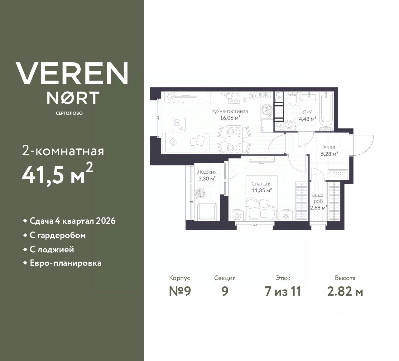 Однокомнатная квартира в Veren Nort Сертолово на 7 этаже. Квартира без отделки, новый владелец может сделать ремонт по индивидуальному проекту. Общая площадь: 41.5 кв.м., жилая: 11.35 кв.м., площадь просторной куxни-гостиной: 16.06 кв.м. Угловая квартира, идеально подойдет любителям тишины и панорамных видов. В квартире одна лоджия, один совмещенный санузел. Высота потолков 2.82 м.