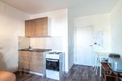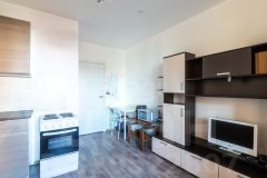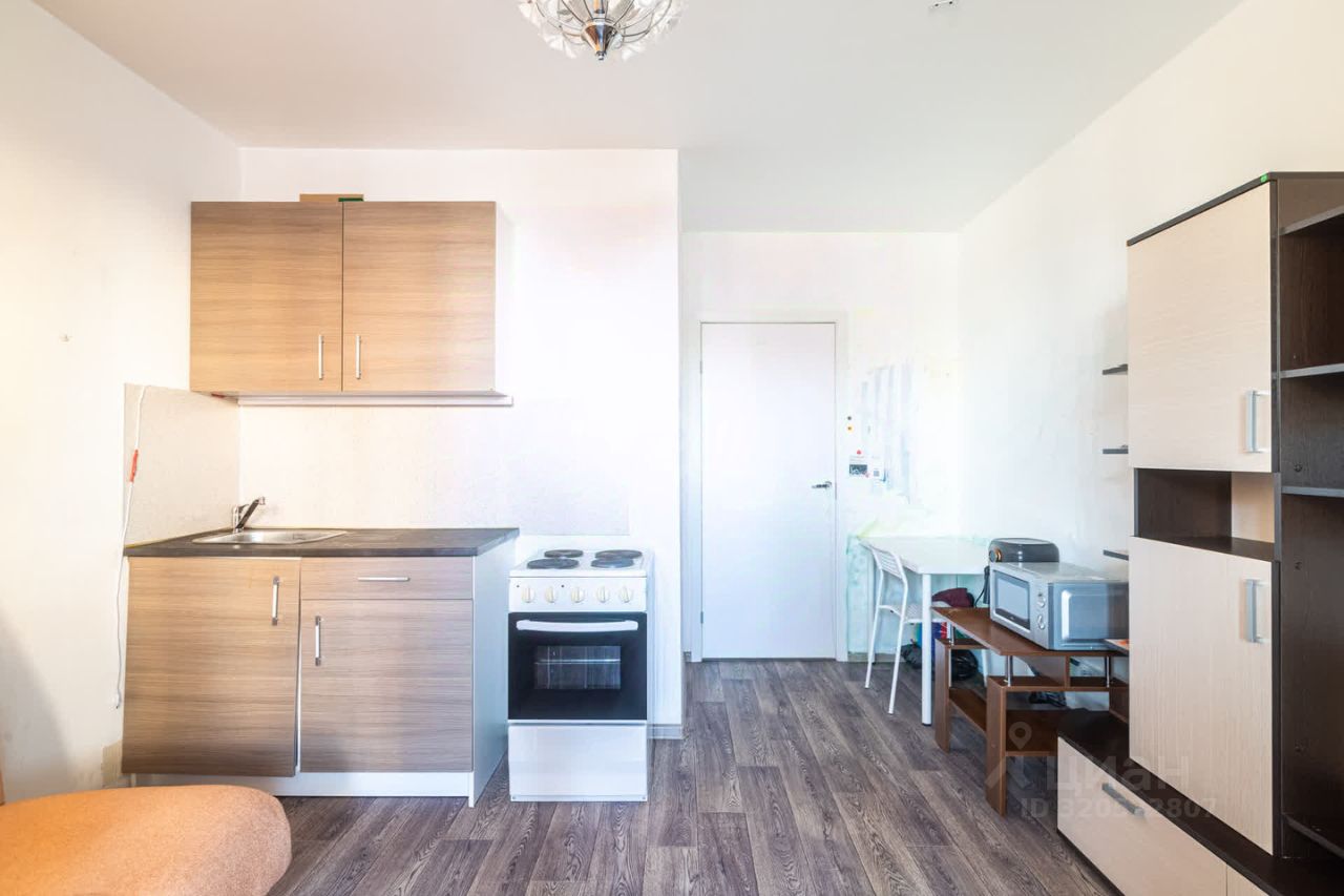 Студия площадью 21,8 кв. м с косметическим ремонтом расположена в кирпично-монолитном доме 2018 года постройки. Железобетонные перекрытия обеспечивают высокий уровень звукоизоляции. В квартире выполнена функциональная планировка с выделенной зоной кухни-гостиной и спальным местом. Ванная комната совмещена с санузлом, установлена современная сантехника. Остаётся вся необходимая техника: стиральная машина, холодильник, духовой шкаф и варочная панель. Меблировка продумана для комфортного проживания. Лоджия выходит на озеленённую территорию с видом на детский сад.