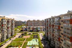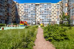 Дом находится в благоустроенном районе с развитой инфраструктурой. Придомовая территория включает детские и спортивные площадки, парковочные места, зоны отдыха с декоративными растениями. Метро "Девяткино" расположено в 15-20 минутах пешком по благоустроенному бульвару Менделеева. В 5 минутах ходьбы — остановка маршрутных такси 205 (до м. "Проспект Просвещения") и 678 (до м. "Озерки"). Выезд на КАД — в 1 км от дома, что обеспечивает быструю транспортную доступность в другие районы города.