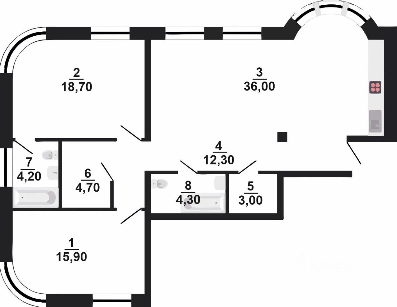 Высота потолка 3,58 м. обеспечивает качественную эргономику планировочного решения.