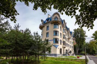 Закругленные углы здания, завершения эркеров и перетекающие свободные формы декоративных элементов перекликаются с силуэтом окружающей парковой территории. Цветовая гамма фасадов основана на сочетании пастельных оттенков бежевого, синего и зеленого цветов.