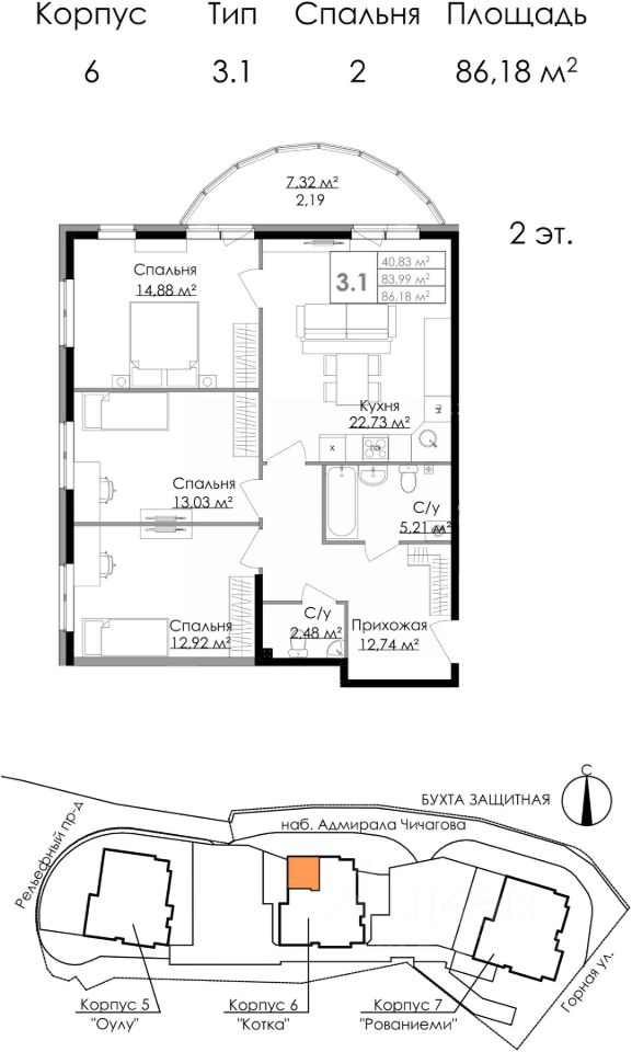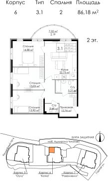 Продаётся 3-комнатная квартира в сданном доме (Дом М6 - Котка), срок сдачи: IV-кв. 2023, общей площадью 86.18 кв.м., на 2 этаже. ЖИЛОЙ КОМПЛЕКС В ВЫБОРГЕ