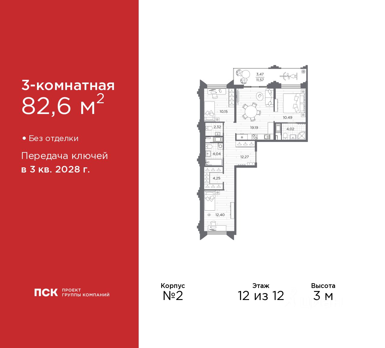 3-комн. квартира в Клубный квартал "Ассамблея" на 12 этаже. Квартира без отделки, полностью готова к ремонту. Общая площадь: 82.6 кв.м., жилая: 35.04 кв.м., площадь просторной кухни-столовой: 19.19 кв.м. Квартира - распашонка, без проходных комнат, окна выходят на paзные стороны дома. В квартире один балкон, два совмещенных и один раздельный санузел. Высота потолков 3 м.