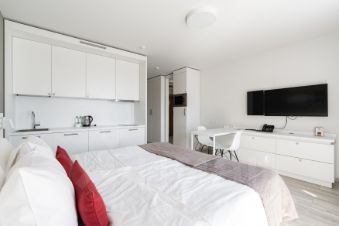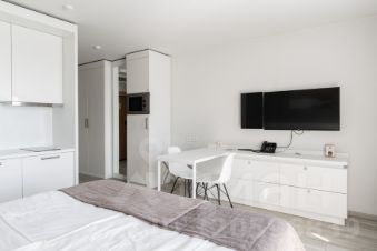 Апартаменты полностью укомплектованы в соответствии с гостиничными стандартами, все необходимое для комфортного проживания: спальное место, рабочая зона, оборудованная кухня, телевизор, бытовая техника, посуда