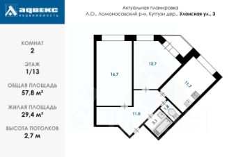 Общая площадь - 57,8 кв. м. Жилая - 29,6 кв. м.