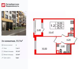 Удобная, классическая, функциональная европланировка, большая кухня-гостиная 15.47 м², просторная прихожая 4.24 м². Общая площадь квартиры - 33.7 м², жилая 10.5 м², высота потолка 2.77 м.