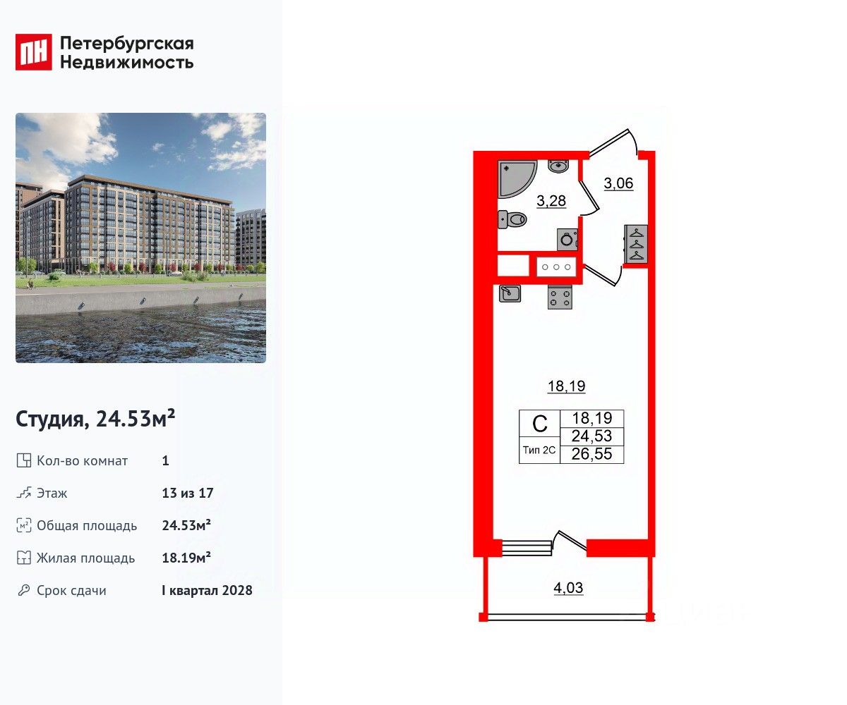 Удобная, классическая, функциональная европланировка, вместительная прихожая 3.06 м². Общая площадь студии - 24.53 м², жилая 18.19 м², высота потолка 2.77 м.