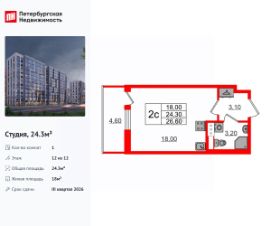 Удобная, классическая, функциональная европланировка, вместительная прихожая 3.1 м². Общая площадь студии - 24.3 м², жилая 18 м², высота потолка 3 м.