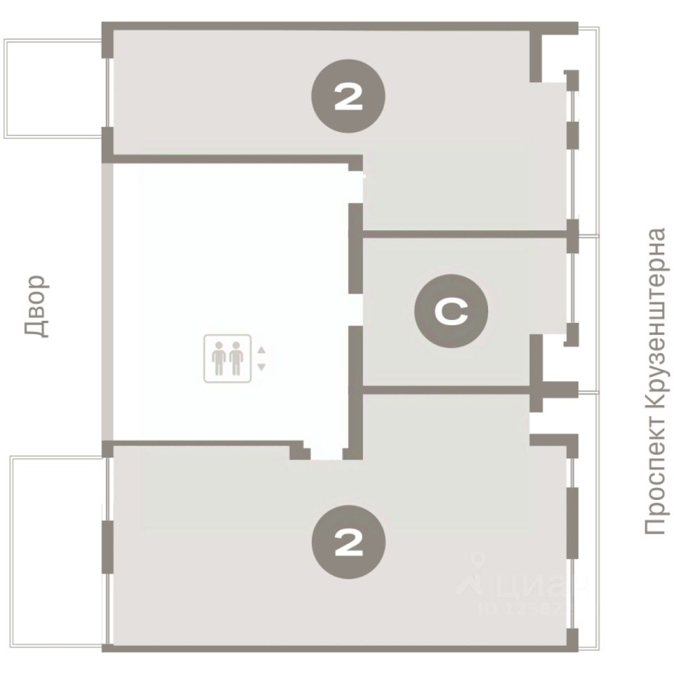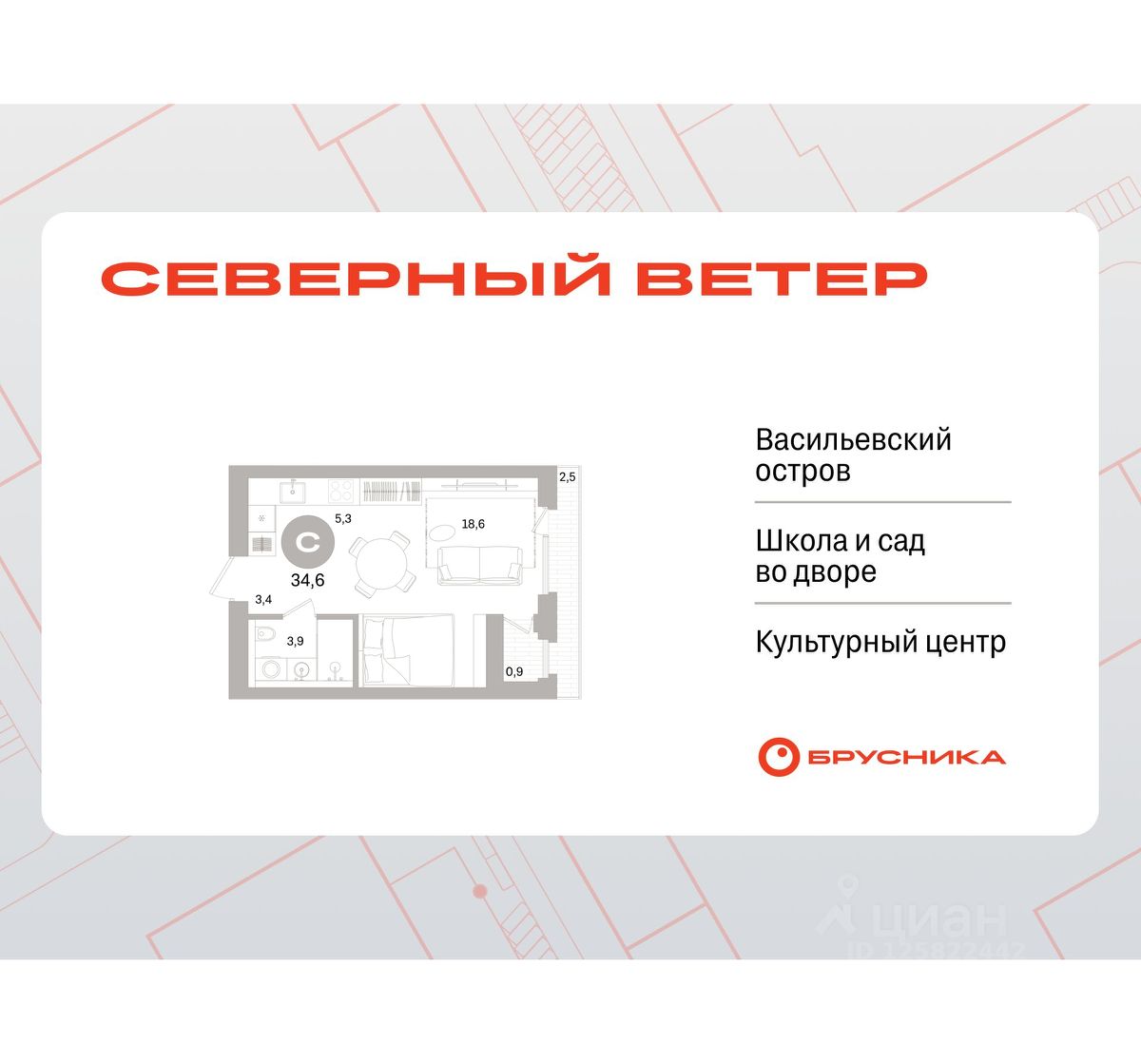 Однокомнатная квартира-студия с предчистовой отделкой в ЖК "Северный ветер" на 2 этаже. Общая площадь: 34.57 кв.м., площадь гостиной 23.9 кв.м., из которых 5.3 кв.м. выделено под кухонную зону. Все окна выходят на одну сторону. В квартире один балкон, один совмещенный санузел. Высота потолков 3.1 м.