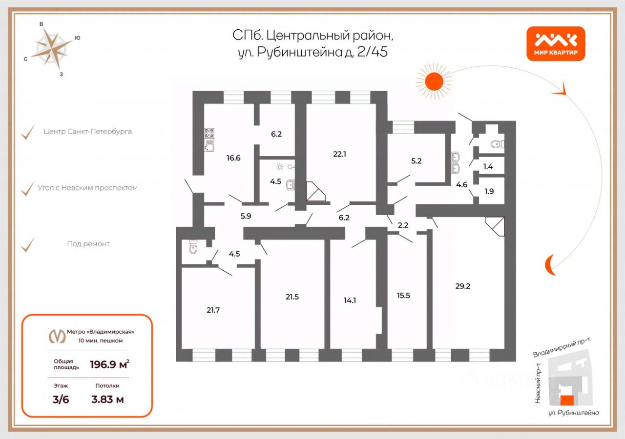 Вход в парадную с улицы Рубинштейна и со двора, Вас встретит пологая мраморная лестница, есть лифт. Из окон открывается вид во двор и улицу Рубинштейна.