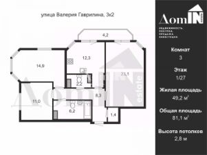 Общая площадь квартиры 79,9 кв.м., жилая площадь 49,2 кв.м., площадь кухни 12, 4 кв.м.