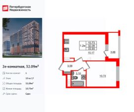 Удобная, классическая, функциональная европланировка, большая кухня-гостиная 15.17 м², вместительная прихожая 3.09 м². Общая площадь квартиры - 32.09 м², жилая 10.73 м², высота потолка 2.77 м.