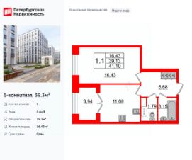 Уникальная планировка, кухня 11.08 м², просторная прихожая 6.68 м². Общая площадь квартиры - 39.3 м², жилая 16.43 м², высота потолка 3 м.