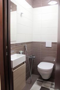 Туалет и ванная: инсталляция WISA, унитаз, все смесители и краны, гигиенический душ АМ РМ, вся фурнитура IDDIS! Вентиляция пассивно-активная с таймером Cata C. Стиральная машина LG (на гарантии).