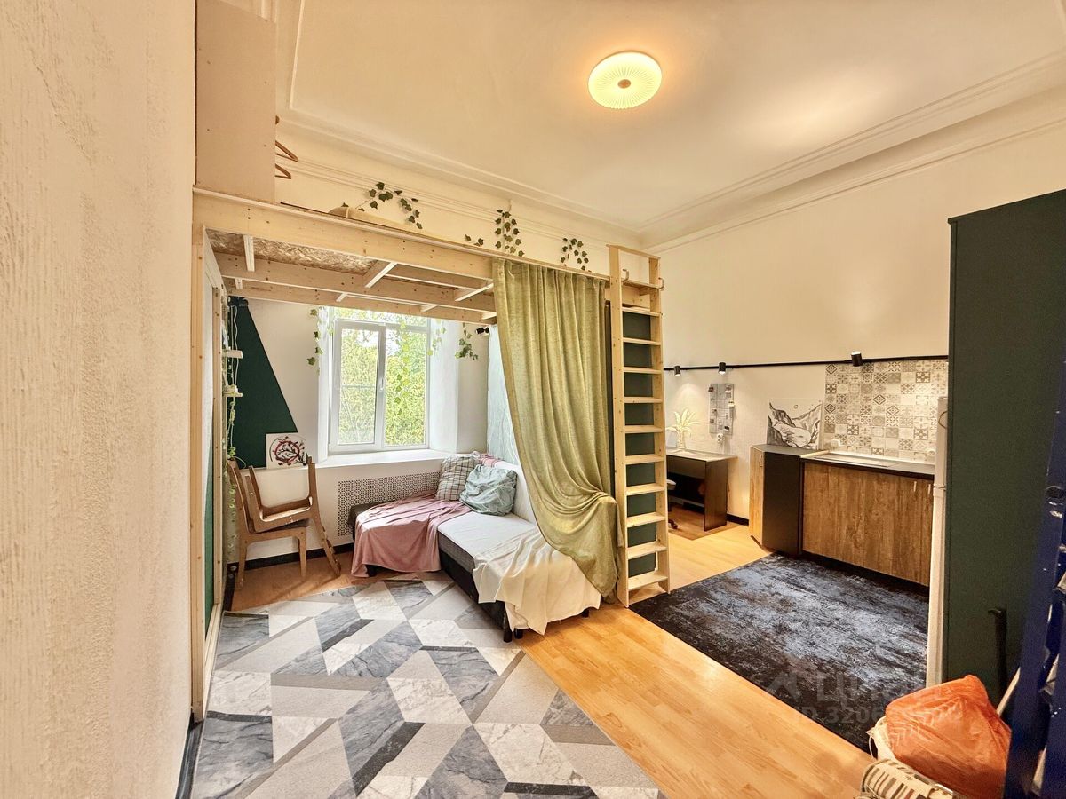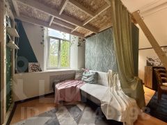- 3 этаж из 3. Аккуратная закрытая парадная, вход с улицы. В комнате 2 больших окна с широкими подоконниками, установлены стеклопакеты. Окна выходят на небольшой зеленый сквер перед домом. Потолки в квартире - 3,72 м, что позволило сделать второй уровень с полноценным спальным местом.