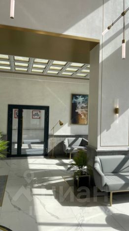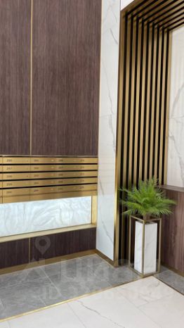 Квартира находится именно в той секции, вход в которую осуществляется через центральную входную группу и лобби с отделкой из керамогранита под мрамор и колоннами с акцентными латунными вставками.