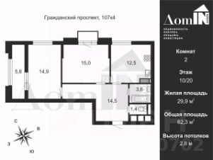 Арт. 113037208 В ПРЯМОЙ продаже современная 2-к квартира площадью 62,3 кв.м в жилом комплексе бизнес-класса в стиле ар-деко "Main House" рядом с метро "Гражданский проспект", с удобным выездом на КАД, закрытой благоустроенной территорией.