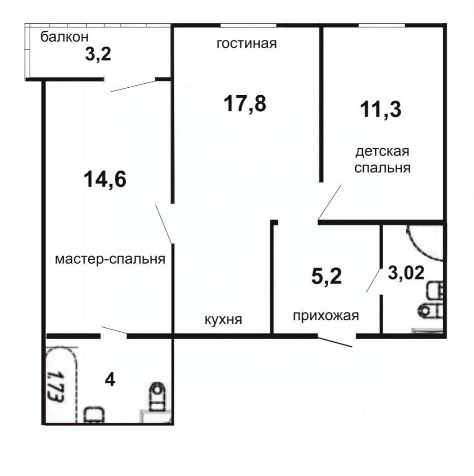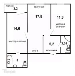 Две изолированные комнаты (14,6м² и 11,3 м²) и просторная кухня-гостиная (17.8 м²).