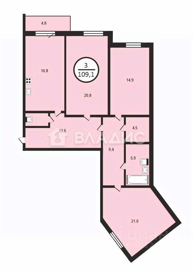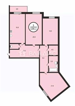 3 изолированные комнаты 21м2, 14,9м2 и 20,8м2