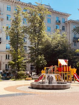 Ухоженный двор с фонтаном и детской площадкой. Всегда есть место для парковки.