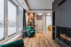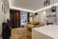 • Кухня-гостиная (22 м²) с итальянским кухонным гарнитуром из массива ясеня, керамогранитными полами с подогревом и техникой NEFF (посудомоечная машина, вытяжка, электрическая плита, духовой шкаф, холодильник, стиральная машина Bosch). В каждой комнате установлены кондиционеры Mitsubishi.