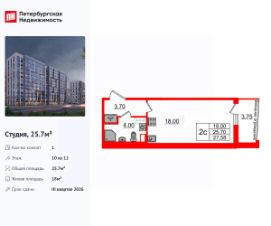Удобная, классическая, функциональная европланировка, просторная прихожая 3.7 м². Общая площадь студии - 25.7 м², жилая 18 м², высота потолка 2.77 м.
