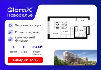 Продается квартира-студия на 11-м этаже в строящемся проекте комфорт-класса GloraX Новоселье. Общая площадь лота составляет 20,91 кв. м, из которых 10,24 кв. м отведено под жилую и 4,40 кв. м под кухонную зону. Номер квартиры - 151