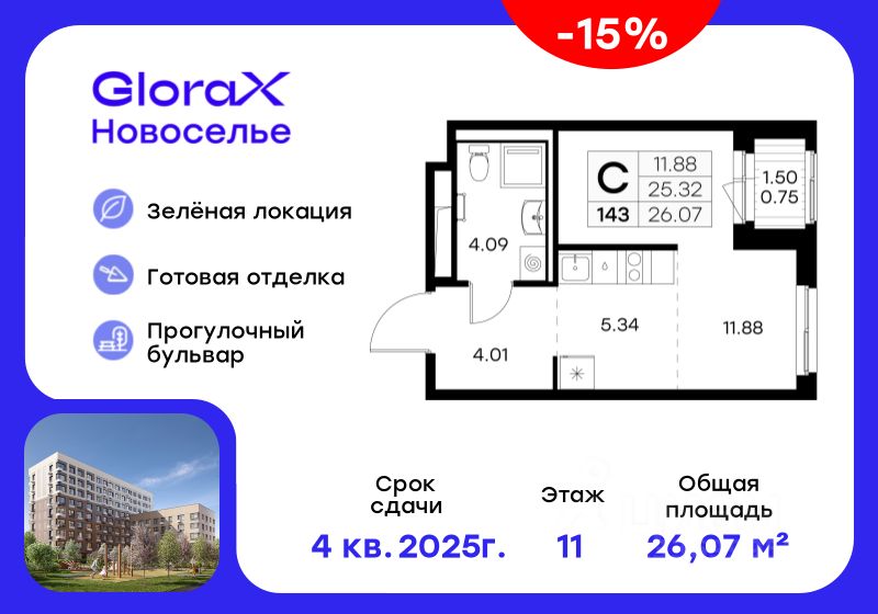 Продается квартира-студия на 11-м этаже в строящемся проекте комфорт-класса GloraX Новоселье. Общая площадь лота составляет 26,07 кв. м, из которых 11,88 кв. м отведено под жилую и 5,34 кв. м под кухонную зону. Номер квартиры - 143