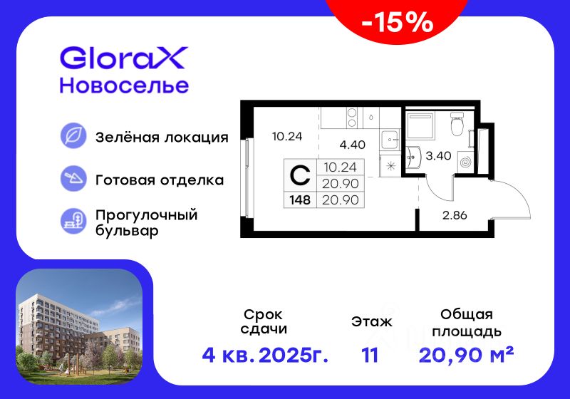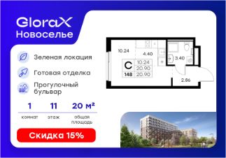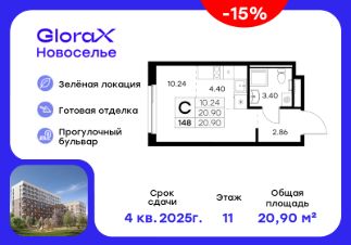 Продается квартира-студия на 11-м этаже в строящемся проекте комфорт-класса GloraX Новоселье. Общая площадь лота составляет 20,90 кв. м, из которых 10,24 кв. м отведено под жилую и 4,40 кв. м под кухонную зону. Номер квартиры - 148