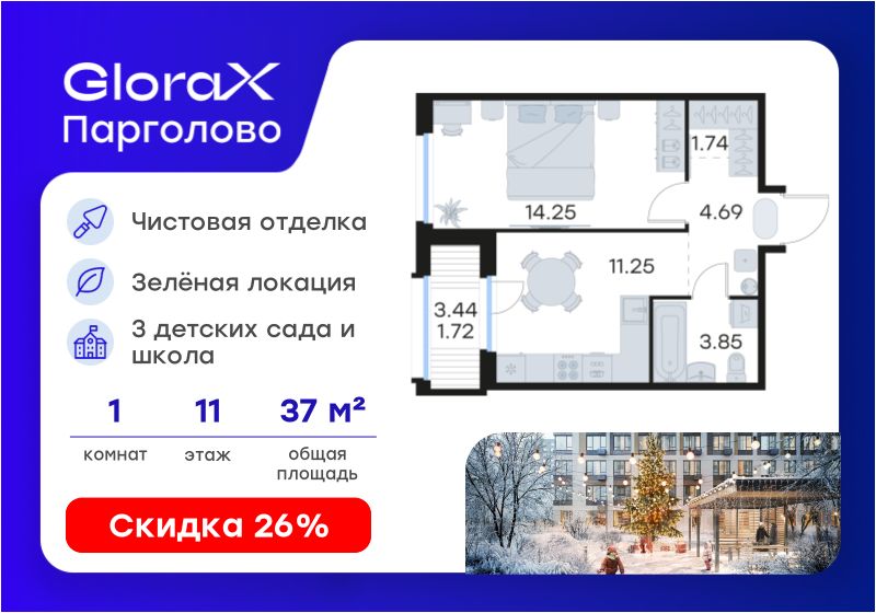 Продается 1-комн. квартира на 11-м этаже в проекте комфорт-класса GloraX Парголово. Общая площадь лота составляет 37,50 кв. м, из которых 14,25 кв. м отведено под жилую и 11,25 кв. м под кухонную зону. Номер квартиры - 98.