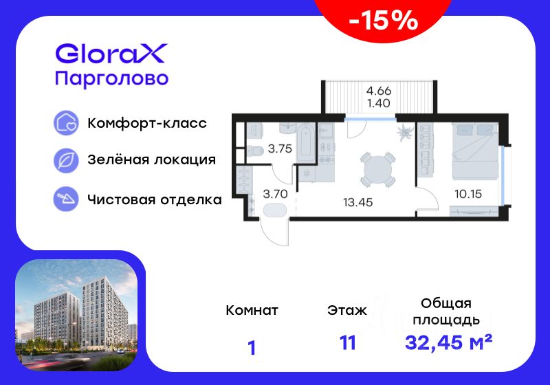 Продается 1-комн. квартира на 11-м этаже в проекте комфорт-класса GloraX Парголово. Общая площадь лота составляет 32,45 кв. м, из которых 10,15 кв. м отведено под жилую и 13,45 кв. м под кухонную зону. Номер квартиры - 100.