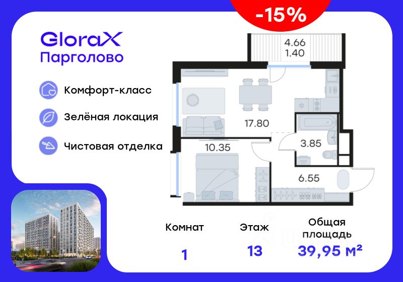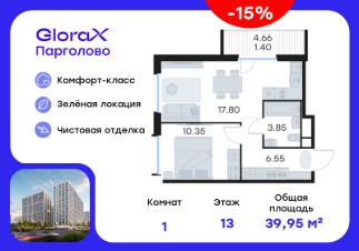 Продается 1-комн. квартира на 13-м этаже в проекте комфорт-класса GloraX Парголово. Общая площадь лота составляет 39,95 кв. м, из которых 10,35 кв. м отведено под жилую и 17,80 кв. м под кухонную зону. Номер квартиры - 119.