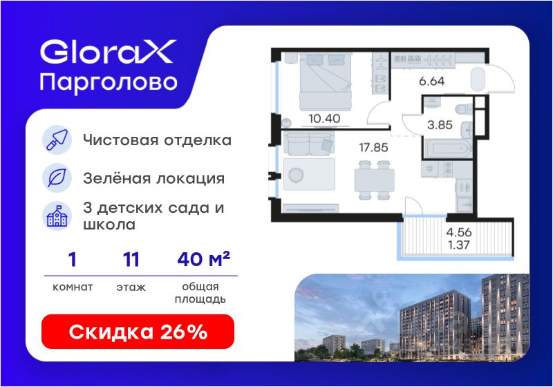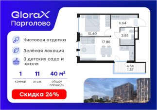 Продается 1-комн. квартира на 11-м этаже в проекте комфорт-класса GloraX Парголово. Общая площадь лота составляет 40,11 кв. м, из которых 10,40 кв. м отведено под жилую и 17,85 кв. м под кухонную зону. Номер квартиры - 250.