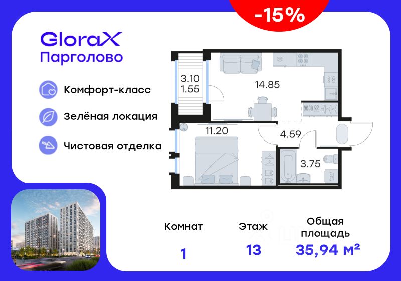 Продается 1-комн. квартира на 13-м этаже в проекте комфорт-класса GloraX Парголово. Общая площадь лота составляет 35,94 кв. м, из которых 11,20 кв. м отведено под жилую и 14,85 кв. м под кухонную зону. Номер квартиры - 262.