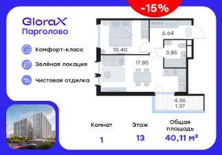 Продается 1-комн. квартира на 13-м этаже в проекте комфорт-класса GloraX Парголово. Общая площадь лота составляет 40,11 кв. м, из которых 10,40 кв. м отведено под жилую и 17,85 кв. м под кухонную зону. Номер квартиры - 270.