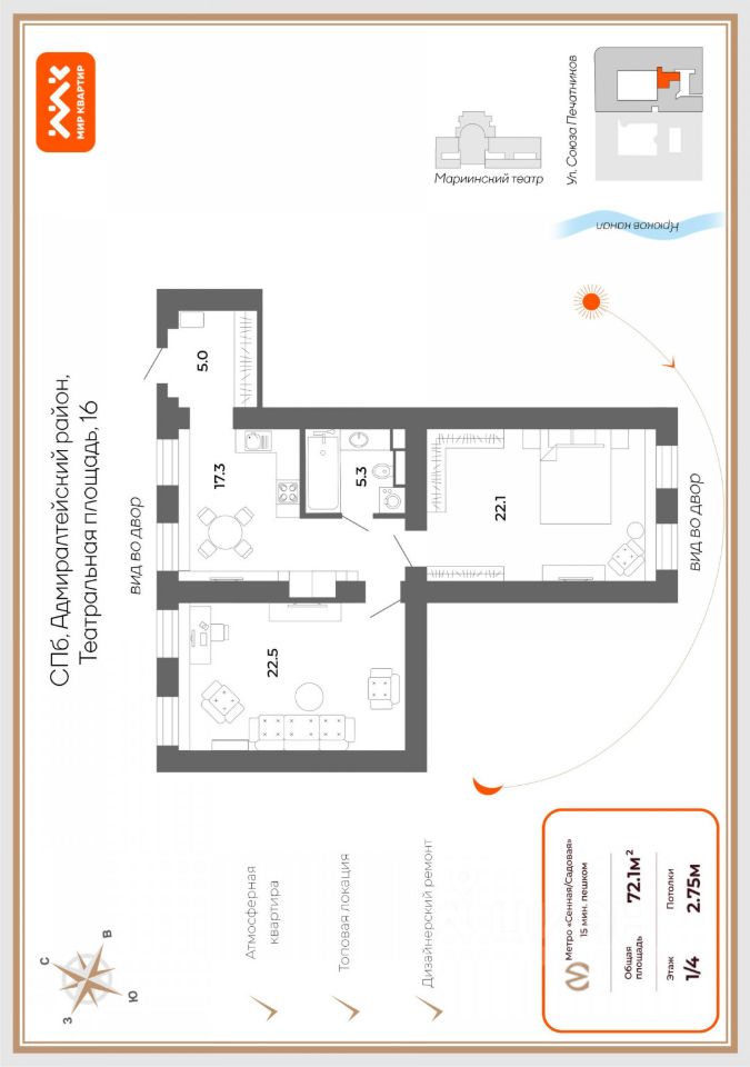 Локация не нуждается в детальном описании, дом находится на Театральной площади напротив основной сцены Мариинского театра. А это значит: развитая инфраструктура, богатая архитектура и высокая транспортная доступность.