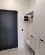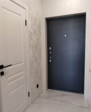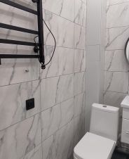 Сделан очень хороший, добротный ремонт с использованием качественных материалов. В прихожей на полу , в санузле на полу и стенах выложена плитка современного дизайна. Стильные смесители черного цвета сочетаются с черными дверными ручками.