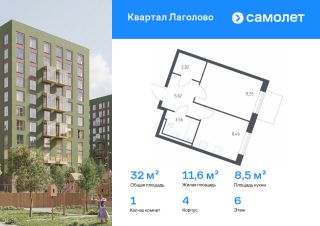 Строим кварталы для жизни с заботой о будущем. Предлагается 1-комнатная квартира комфорт-класса 32,01 кв.м в корпусе 4 на 6 этаже, в ЖК "Квартал Лаголово"