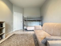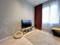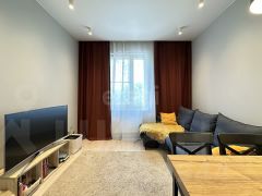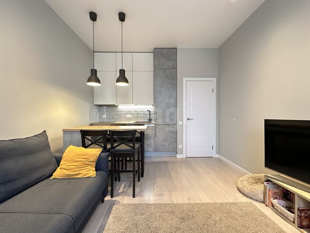 Однокомнатная квартира площадью 44,9 кв. м находится на втором этаже современного восьмиэтажного дома, сданного в эксплуатацию в 2017 году. Планировка продумана для комфортного проживания: изолированная спальня 16,8 кв. м с гардеробной зоной и просторная кухня-гостиная 14,3 кв. м с высокими потолками 3 метра, что визуально увеличивает пространство и позволяет удобно разместить обеденную группу и мягкую зону.