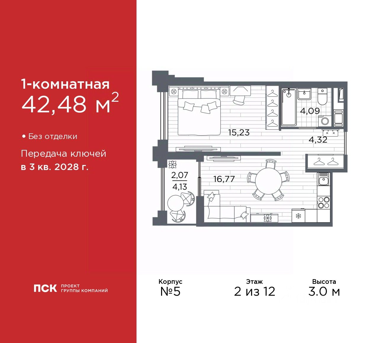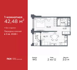 Однокомнатная квартира от застройщика в Клубный квартал "Ассамблея" на 2 этаже. Квартира без отделки, новый собственник может сделать ремонт по индивидуальному проекту. Общая площадь: 42.48 кв.м., жилая: 15.23 кв.м., площадь просторной кухни-столовой: 16.77 кв.м. Все окна выходят на одну сторону. В квартире одна лоджия, один совмещенный санузел. Высота потолков 3.0 м.
