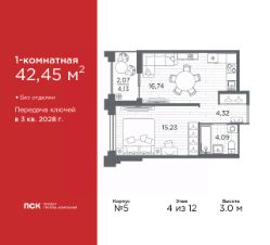 Продается однокомнатная квартира в Клубный квартал "Ассамблея" на 4 этаже. Квартира без отделки, после выдачи ключей можно делать ремонт. Общая площадь: 42.45 кв.м., жилая: 15.23 кв.м., площадь просторной кухни-столовой: 16.74 кв.м. Все окна выходят на одну сторону. В квартире одна лоджия, один совмещенный санузел. Высота потолков 3.0 м.