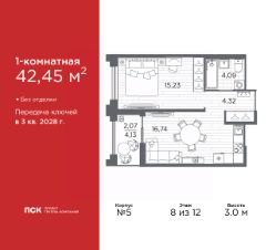 1-комн. квартира в Клубный квартал "Ассамблея" на 8 этаже. Квартира без отделки, новый владелец может сделать ремонт по индивидуальному проекту. Общая площадь: 42.45 кв.м., жилая: 15.23 кв.м., площадь просторной кухни-столовой: 16.74 кв.м. Все окна выходят на одну сторону. В квартире одна лоджия, один совмещенный санузел. Высота потолков 3.0 м.