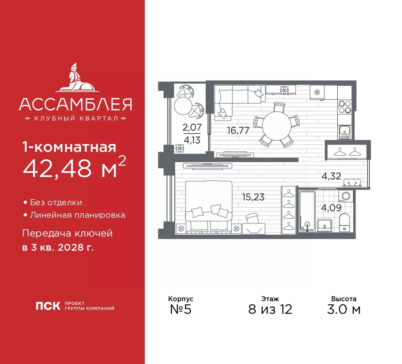Продается однокомнатная квартира от застройщика в Клубный квартал "Ассамблея" на 8 этаже. Квартира без отделки, после выдачи ключей можно делать ремонт. Общая площадь: 42.48 кв.м., жилая: 15.23 кв.м., площадь просторной кухни-столовой: 16.77 кв.м. Все окна выходят на одну сторону. В квартире одна лоджия, один совмещенный санузел. Высота потолков 3.0 м.