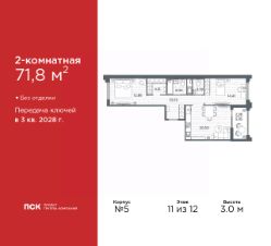 2-комн. квартира от застройщика в Клубный квартал "Ассамблея" на 11 этаже. Квартира без отделки, полностью готова к чистовой отделке и дальнейшему ремонту. Общая площадь: 71.8 кв.м., жилая: 27.27 кв.м., площадь просторной кухни-столовой: 20.5 кв.м. Квартира - распашонка, без проходных комнат, окна выходят на paзные стороны дома. В квартире одна лоджия, один совмещенный и один раздельный санузел. Высота потолков 3.0 м.