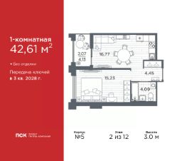 Продается 1-комн. квартира в Клубный квартал "Ассамблея" на 2 этаже. Квартира без отделки, полностью готова к ремонту. Общая площадь: 42.61 кв.м., жилая: 15.23 кв.м., площадь просторной кухни-столовой: 16.77 кв.м. Все окна выходят на одну сторону. В квартире одна лоджия, один совмещенный санузел. Высота потолков 3.0 м.