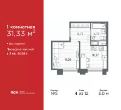 1-комн. квартира в Клубный квартал "Ассамблея" на 4 этаже. Квартира без отделки, после выдачи ключей можно делать ремонт. Общая площадь: 31.33 кв.м., жилая: 11.29 кв.м., площадь просторной кухни-столовой: 10.17 кв.м. Все окна выходят на одну сторону. В квартире один совмещенный санузел. Высота потолков 3.0 м. Дом монолитный, черырехподъездный, высотой 12 этажей. Квартира находится во 2-й секции в корпусе 5. На этаже 8 квартир. В подъезде 1 пассажирский и 1 грузовой лифт. Окончание строительства - 3 квартал 2028 года. Оформление сделки по договору долевого участия. В шаговой доступности от жилого комплекса расположены станции метро (расстояние по прямой): "Горный институт" (1.0 км), "Василеостровская" (1.4 км), "Приморская" (1.5 км), также недалеко от этого корпуса расположены станции метро: "Спортивная", "Чкаловская". "Клубный квартал Ассамблея" — проект бизнес-класса на Васильевском острове, в самом сердце исторического Петербурга. Комплекс состоит из пяти корпусов переменной этажности — от 7 до 12 этажей — с выразительной архитектурой в стиле неомодернизма: светлый клинкер, панорамное остекление, просторное лобби с потолками высотой почти 8 метров. Потолки — до 3,2 метров. Подземный паркинг на 667 машиномест. Комфорт и инфраструктура Проект ориентирован на комфортную городскую жизнь. В закрытом дворе — ландшафтное озеленение, современные детские и спортивные площадки. Внутренний клуб для резидентов включает коворкинг, переговорные, кинозал, фитнес и бьюти-зону. IP-домофония с просмотром камер видеонаблюдения, дистанционное открывание дверей и доступа на территорию и в парадную со смартфона и планшета, просмотр показаний счетчиков, приложение для жителей PSK Home. Локация Расположение на Васильевском острове — сильная сторона проекта. До четырех станций метро ("Горный институт", "Василеостровская", "Спортивная", "Приморская") — 515 минут пешком. В шаговой доступности — зелёные зоны, культурные учреждения, в том числе сад "Василеостровец" и ДК имени Кирова. Основные магистрали Большой, Средний и Малый проспекты, Наличная и Уральская улицы. Съезд на ЗСД расположен недалеко от станции метро "Приморская", близ береговой линии. Благовещенский и Дворцовый мосты соединяют остров с центром города, а мосты Тучков, Биржевой и Бетанкура — с Петроградской стороной. Застройщик Группа компаний ПСК является одной из ведущих девелоперских компаний Санкт Петербурга. На протяжении 18 лет она возводит в Северной столице качественное жилье премиум, бизнес и комфорт-класса, социальные объекты школы и детские сады, апарт-отели и торговые центры. Является шестикратным обладателем золотого знака "Надежный застройщик России". #zM29Ag