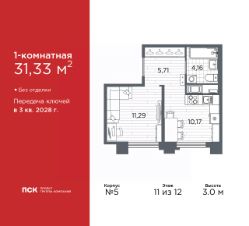 Продается 1-комн. квартира от застройщика в Клубный квартал "Ассамблея" на 11 этаже. Квартира без отделки, после выдачи ключей можно делать ремонт. Общая площадь: 31.33 кв.м., жилая: 11.29 кв.м., площадь просторной кухни-столовой: 10.17 кв.м. Все окна выходят на одну сторону. В квартире один совмещенный санузел. Высота потолков 3.0 м.
