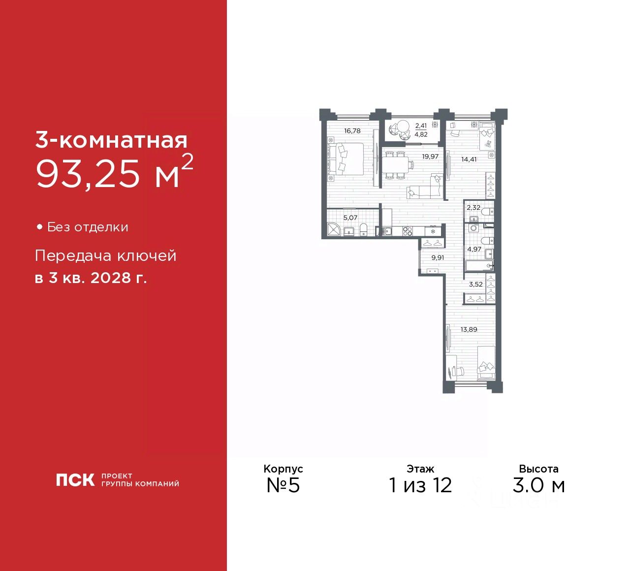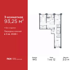 Трехкомнатная квартира в Клубный квартал "Ассамблея" на 1 этаже. Квартира без отделки, после оформления собственности можно делать ремонт. Общая площадь: 93.25 кв.м., жилая: 45.08 кв.м., площадь просторной кухни-столовой: 19.97 кв.м. Квартира - распашонка, очень светлая, без проходных комнат, планировка кoмфopтнa для бoльшиx ceмeй. В квартире одна лоджия, два совмещенных и один раздельный санузел. Высота потолков 3.0 м.