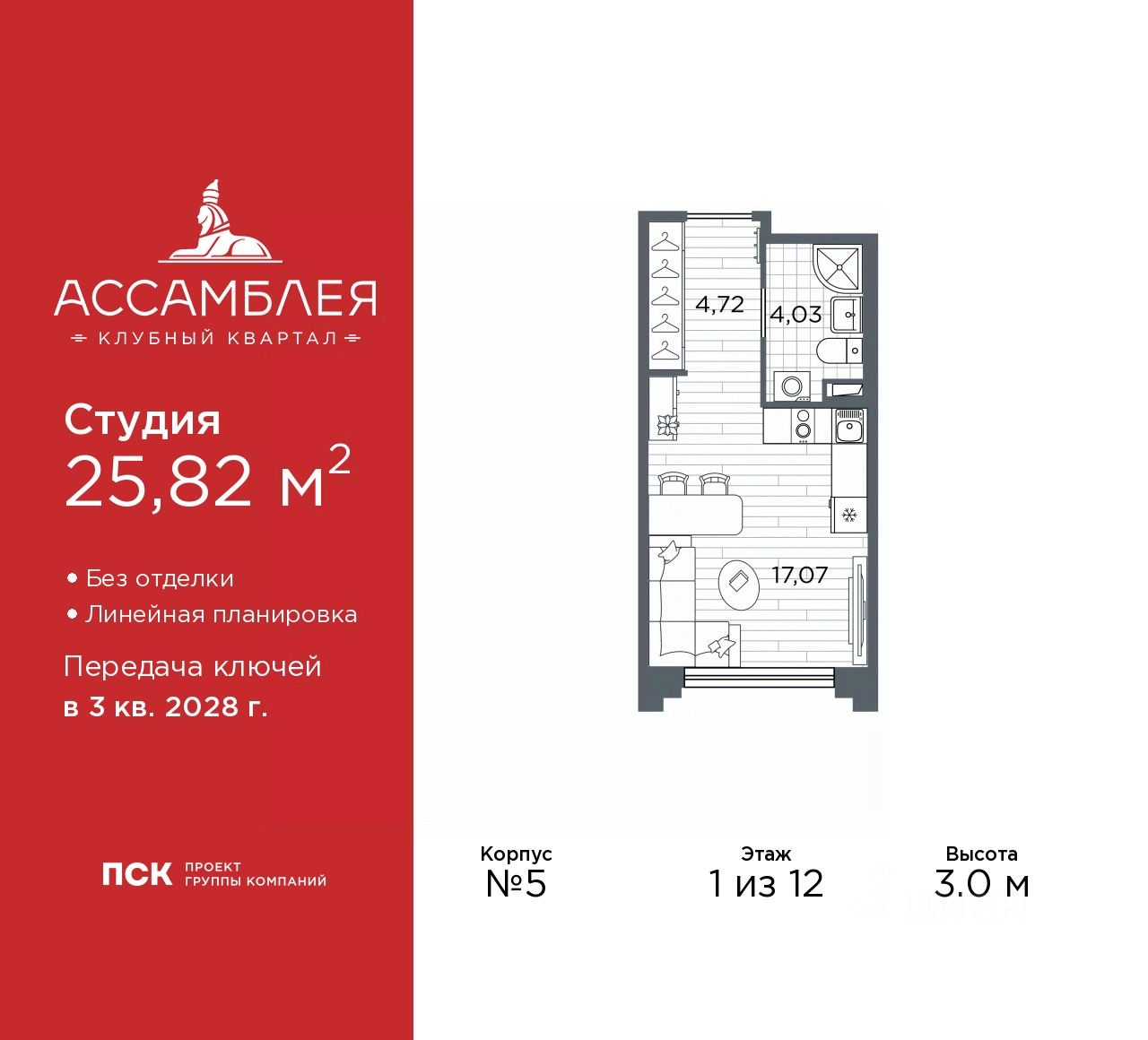 1-комн. квартира-студия от застройщика в Клубный квартал "Ассамблея" на 1 этаже. Квартира без отделки, новый владелец может сделать ремонт по своему проекту. Общая площадь: 25.82 кв.м., площадь гостиной 17.07 кв.м., из которых 5 кв.м. выделено под кухонную зону. Все окна выходят на одну сторону. В квартире один совмещенный санузел. Высота потолков 3.0 м.